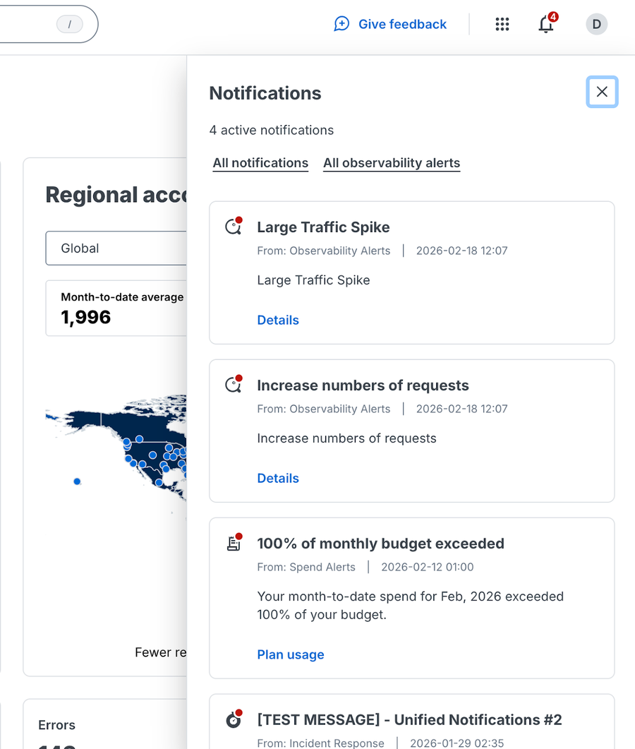 We're excited to announce a significant improvement to how alerts and notifications are surfaced in the Fastly control panel. Previously, customers had to navigate between multiple locations, check one place for support and maintenance notices, another for observability alerts, and then into billing settings for spend alerts. Today, we're bringing all of these alerts together into a centralized experience where you can access notifications with complete situational awareness.