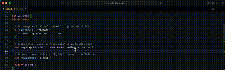 Navigate to the definition of ACLs, tables, backends, local variables, and parameters using Ctrl+Click / Cmd+Click or F12