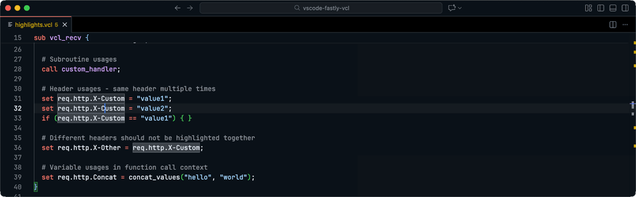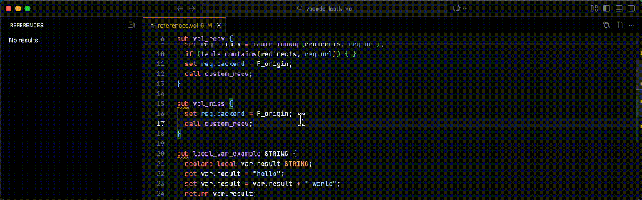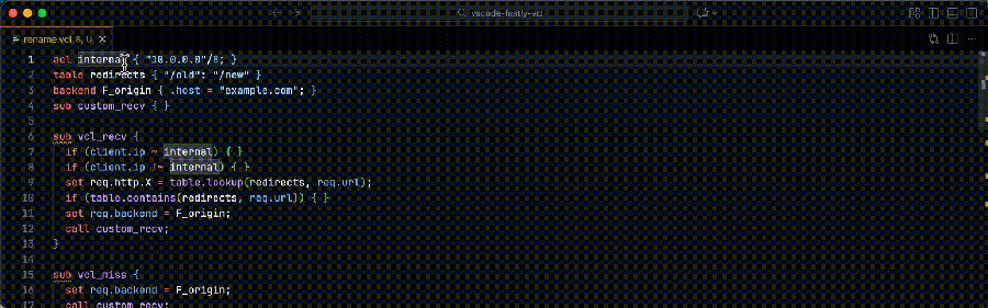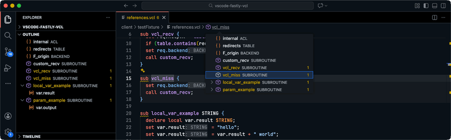 Quickly find and navigate to subroutines, backends, ACLs, tables, and other symbols across all open VCL files using Cmd+T (Ctrl+T on Windows/Linux).