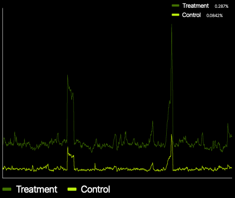 A good example of how Fastly utilizes distributed decision making is our Precision Path algorithm. Each server tracks the health of all its TCP connections. If a server detects a degradation in performance on a TCP connection, it tests all available routes and selects the most viable new path in order to route around the issue. We can do this since Fastly pushes routing information all the way down to each server (i.e., local decision making). So, the decision to select a new path is done in the affected server, using TCP performance metrics and local routing information. The illustration below shows the increased performance after treatment is applied to the impacted connection. The graph shows the number of bits transmitted at each time step. The control line shows performance on the original network path, and the treatment line shows performance measured on the best alternative path.