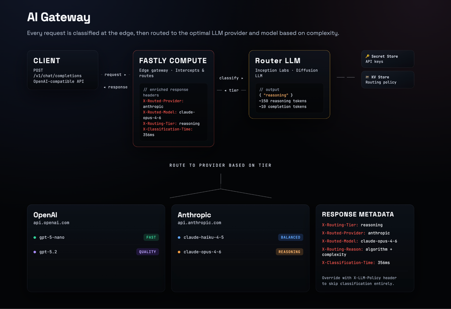 One thing I like about this architecture is that the routing policy lives in Fastly's KV Store, not in code. You can change which tier maps to which model, swap providers, adjust fallback chains, all without redeploying.