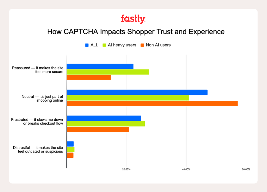 47% of all shoppers are neutral toward CAPTCHA, compared to 41% of heavy AI users.