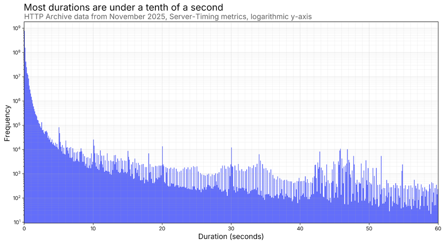 I found two and a half billion Server-Timing metrics. I dug into the dur values and found that most of them are very tiny, indicating measurement of very brief internal processing, like a database lookup or template processing: