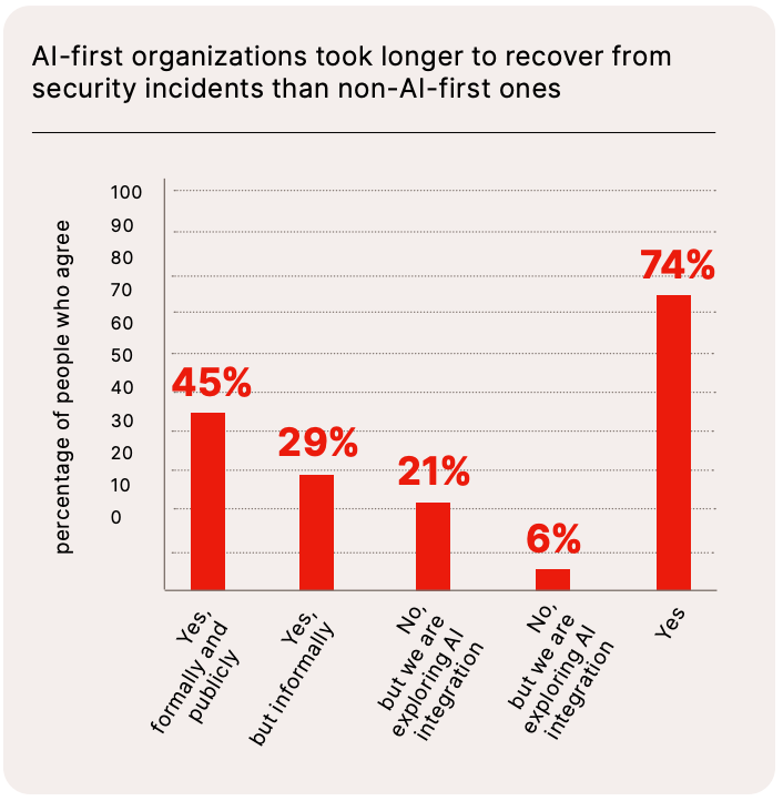 • AI-first businesses take 80 days longer to recover from security incidents (6.8 months vs. 3.9 months), with incidents costing 135% more