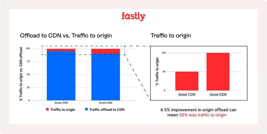 Así pues, una mejora del 5 % en el rendimiento de la descarga a la CDN puede conllevar una reducción del 50 % en la carga del origen (ver abajo).