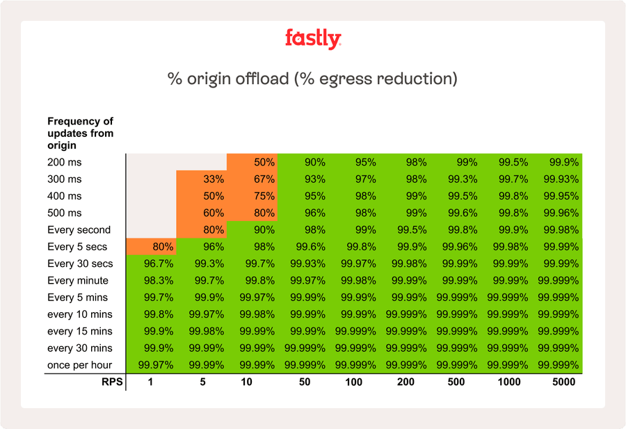 Instant Purge de Fastly es un ejemplo excelente de cómo una mejor CDN puede ayudarte a ir más allá. Fastly puede purgar contenido a nivel mundial en 150 ms (a 31 de diciembre de 2022), lo que significa que cualquier contenido que se actualice desde el origen a intervalos más grandes que 150 ms se puede distribuir desde la memoria caché. Ten en cuenta que hace falta un volumen sorprendentemente bajo de peticiones por segundo (RPS) de dichos datos para lograr liberar al origen de una gran cantidad de tráfico.