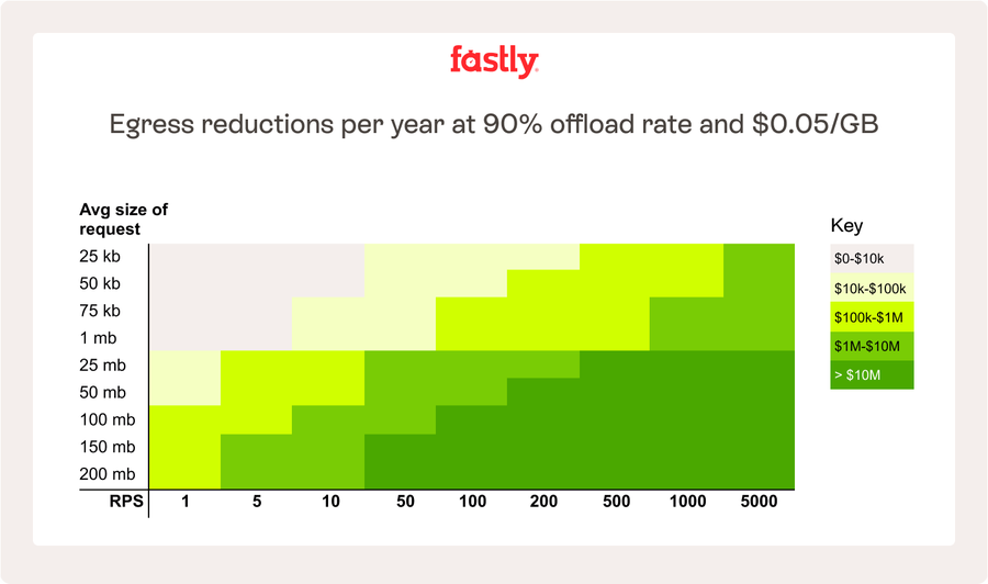 Este gráfico muestra el porcentaje de descarga de una API o punto de conexión de petición de datos en tu infraestructura, según la frecuencia de actualización con nuevos datos (desde 200 ms a una vez al día), comparada con el número de peticiones por segundo que se envía a dicho punto de conexión. Como puedes ver, incluso datos que se actualizan cada 200 ms pueden arrojar nada menos que un 50 % de descarga con solo 10 RPS. Por si fuera poco, la mayor parte de este gráfico es verde, con más de un 90 % de descarga. Ante estas cifras, cualquier API podría atenderse desde la memoria caché. Cuando decimos que los clientes de Fastly consiguen un 189 % de retorno de la inversión, se trata de estadísticas que son posibles, en gran parte, gracias a este nivel de ahorro en el tráfico de salida.