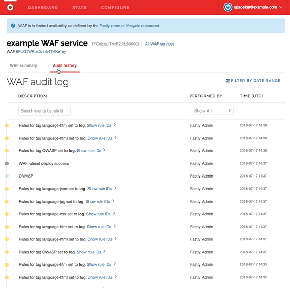 Audit history displays a WAF audit log with all configuration changes made to your WAF. You can use this page to determine who made certain types of configuration changes to the WAF, and when the changes were made.