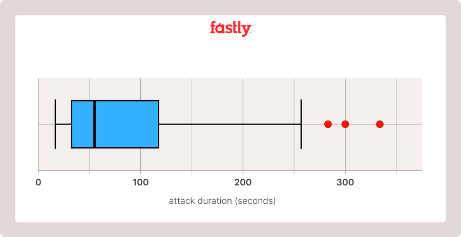 **Attack duration data was collected by looking at the ingress requests to Fastly network from 2023-07-01 to 2023-10-12. The onset of attack is registered when a 30% increase from anticipated baseline is detected, and it ends when traffic is back to expected levels. We have excluded known organic traffic spikes and load testing from this dataset.
