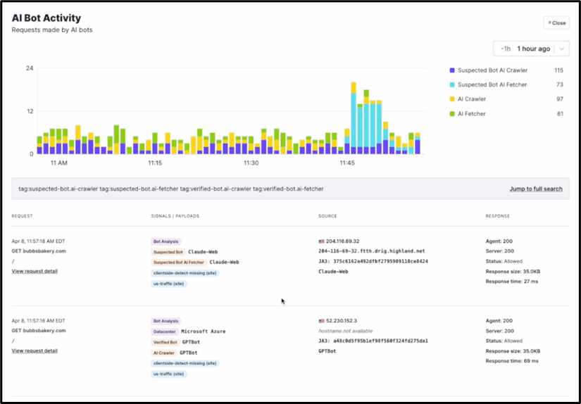 Fastly AI Bot Management helps protect your content from unwanted AI bot scraping. Included for all Fastly Bot Management customers, it allows you to identify suspected or verified AI bot traffic and build rules to block, deceive, or otherwise unwanted behaviors from AI bots.