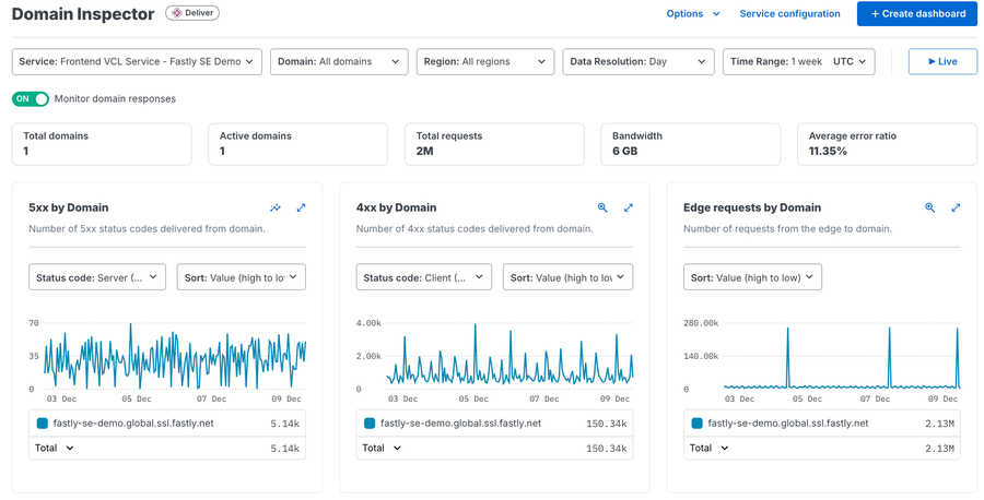 Effortlessly monitor traffic for a single fully qualified domain name (FQDN) or multiple domains within a Fastly service. Account for every domain request, byte, and status code or quickly determine edge or origin issues with our combined edge and aggregated origin metrics without needing to send log data to a third-party data collector.