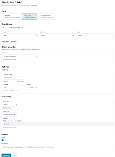 Additionally, you can also use rate limiting to control the impact of client requests on your applications and APIs. Our rule builder allows you to customize your rate limiting based on a wide range of conditions, including custom signals.