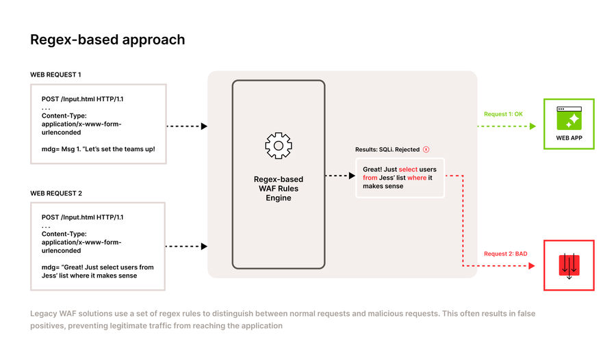 In the example above, an end-user submits a form with two different responses. Request 1 says “Let’s set the teams up!” while Request 2 says “Great! Just select users from Jess’ list where it makes sense”. Although Request 1 makes it through to the web app, Request 2 is rejected and determined as a Bad Request, even though the content is benign.