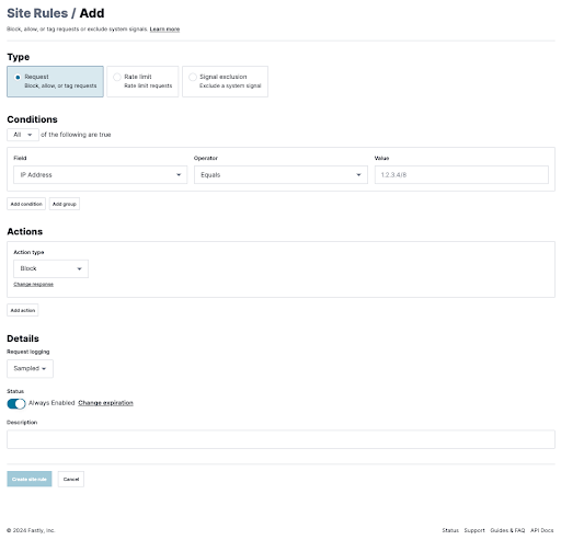 Figure 5: The Fastly Next-Gen WAF rule builder provides an intuitive interface for quickly setting up or modifying rules.