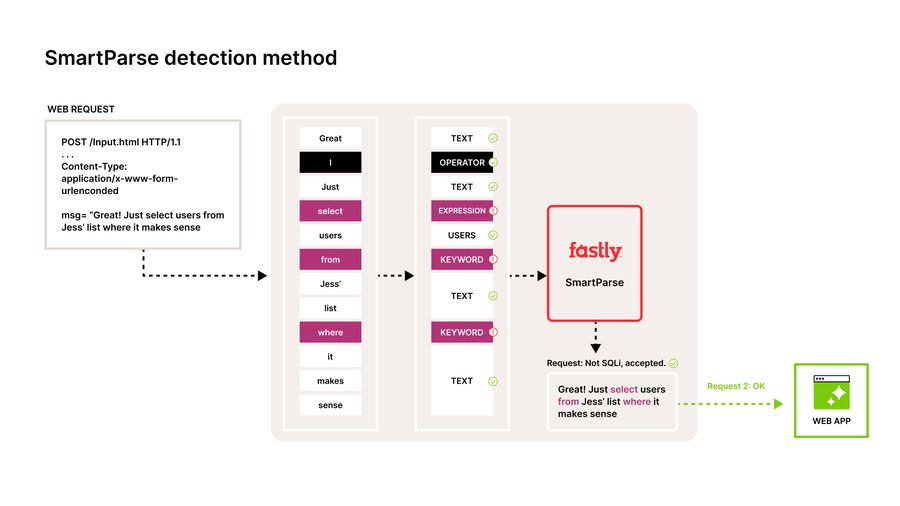 The Fastly Next-Gen WAF detects potential attacks without relying on the regex pattern matching of legacy WAFs. Instead, our detection engine SmartParse analyzes request parameters to determine whether the code is actually executable and tokenizes the results. This intelligent approach has a much lower false-positive rate and is much faster at detecting OWASP Top 10, API, and other advanced application attacks.