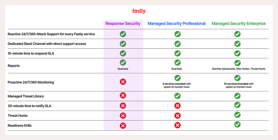 To maximize the performance, availability, and security of your organization’s apps & APIs, Fastly’s Response Security, Managed Security Professional, and Managed Security Enterprise services provide effective, turnkey solutions to fit any enterprise.