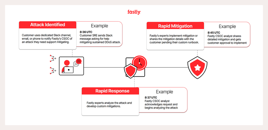 Fastly Response Security customers are given direct access to Fastly’s Customer Security Operations Center (CSOC) via email, phone, support ticket, or dedicated Slack channel. When attacks occur, you use any of these contact methods to gain rapid support and guidance to mitigate their impacts. Our team will leverage any of your Fastly Security products to craft tailored solutions that effectively mitigate the attack without affecting legitimate traffic.